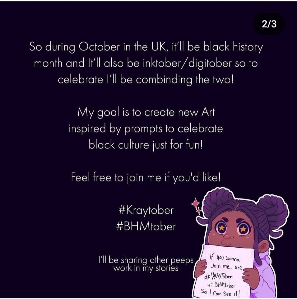 Black history coincides with lots of drawing/art challenges popularised on social media. I have had @simkrays Black History Month Challenge saved for years because I love that it acknowledges Black History Month whilst most are American centric and only focus on Halloween.