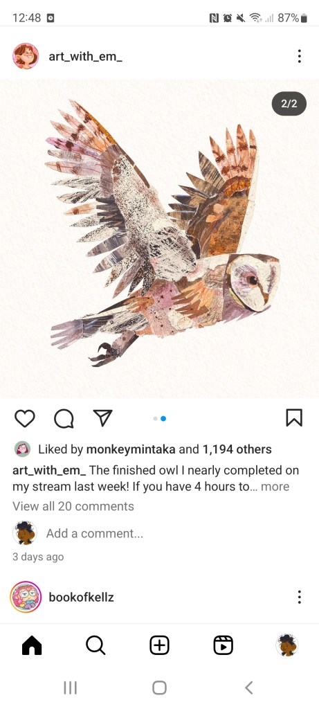 There is something i love about collage animals. I don’t know why I love that medium for portraying animals but I feel it gives them so much character. Emily Schofield (IG @Art_with_Em) makes some beautiful collage animals too. Most recently in a live stream she made a gorgeous owl. Today I saw think link between their two styles of collage.